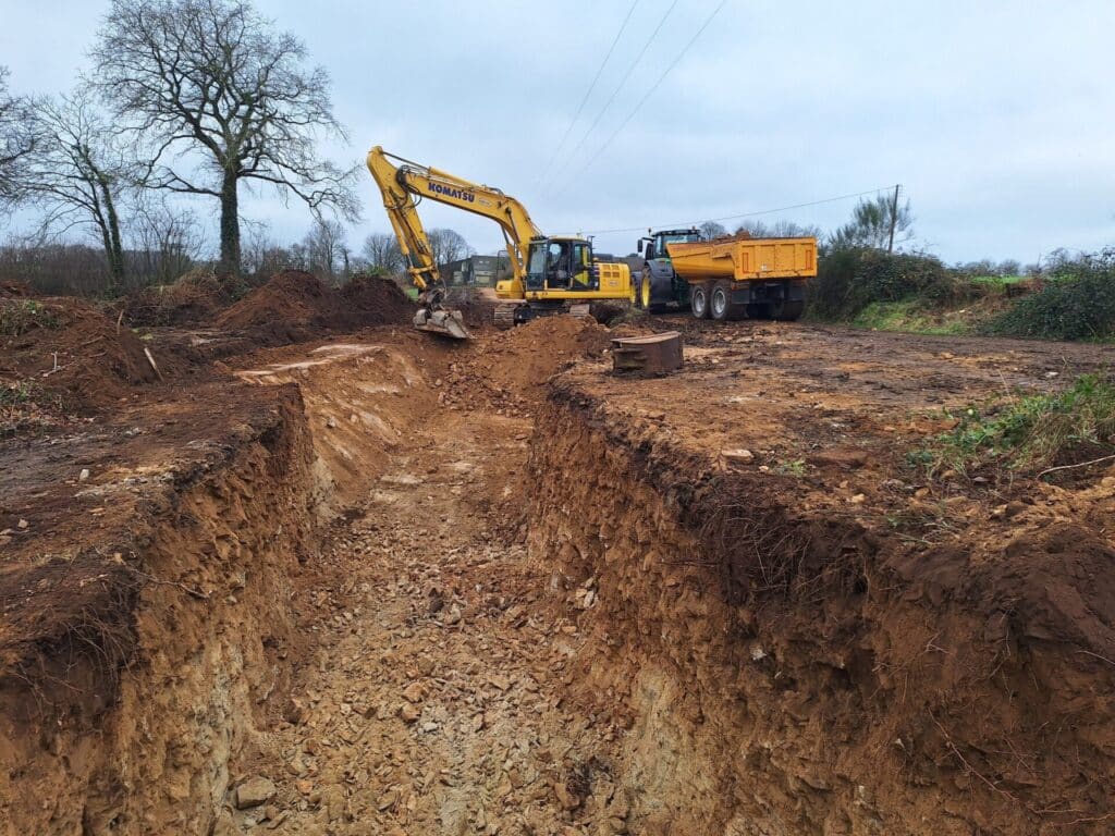Terrassement pour la pose d’un boviduc et réalisation de 350 mètres de chemin à vache sur la commune de Plonéis.